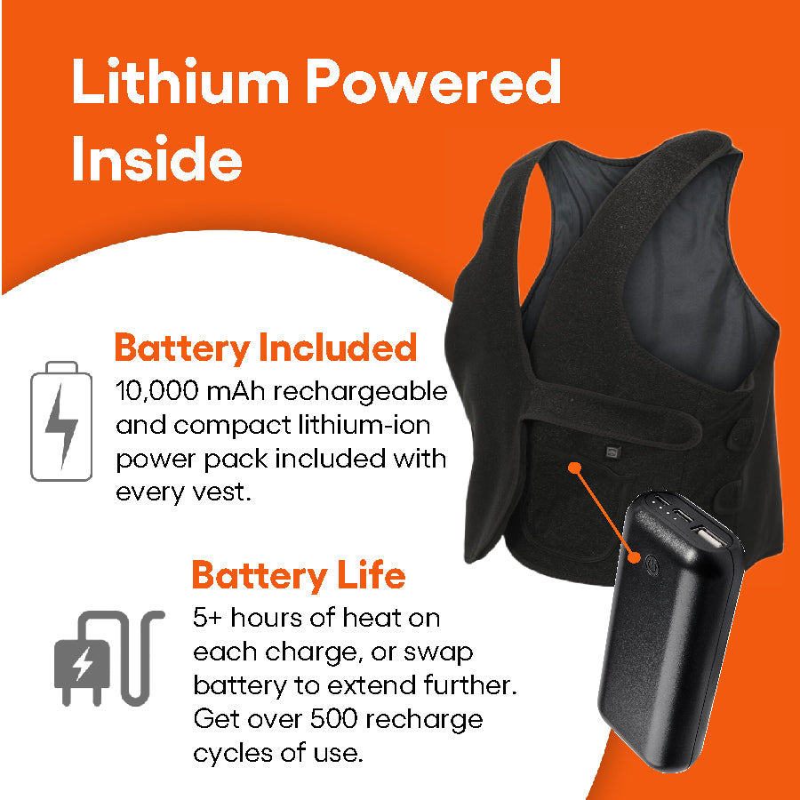 Simply plug the USB cord end into any mobile USB battery pack and hold the button for 5 seconds to kick on the heaters. Vest will heat for approximately 4-6 Hours on an included 10,000-mAh portable USB Power Pack lithium battery.