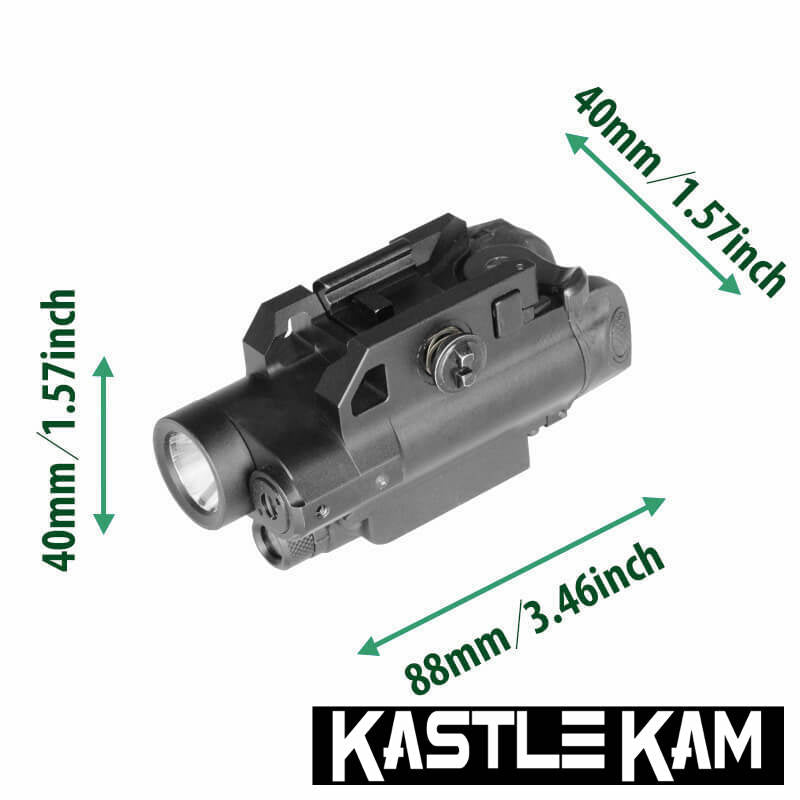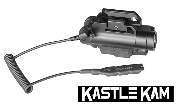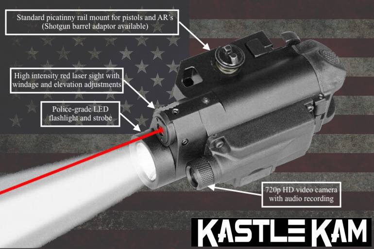 KastleKam's HD video and audio camera is combined with a laser sight and blinding bright flashlight in this compact machined aluminum housing. It mounts directly to a Picatinny Rail on pistols and ARs. A remote pressure switch is included for AR applications. We also sell a 12/20 Ga Picatinny adaptor for shotgun barrel application.