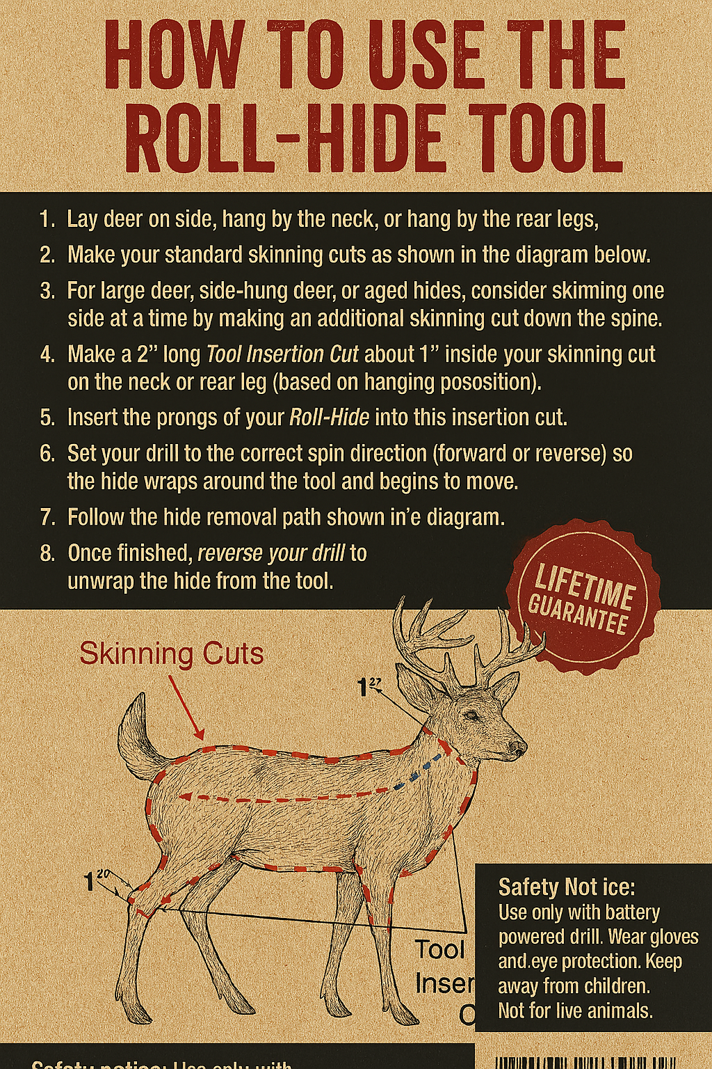 Eliminate the time you spend skinning your deer! Roll-Hide is the fastest, easiest and safest way to remove the hide from deer, elk and other big game animals. Use any battery powered or corded drill to simply "roll the hide off" of your animal.